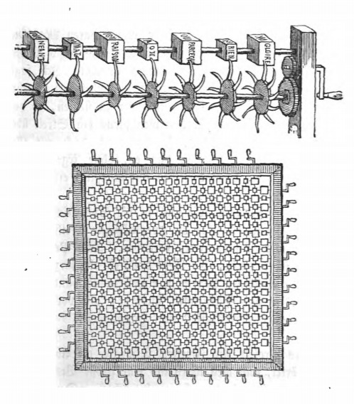 Here we see an image of a machine created by one of the professors from the Grand Academy on Balnibarbi. This machine had all the words in the language of Balnibarbi in different moods, tenses, and declensions written on blocks. These blocks were held together by wires on a frame, and students of the professor would rotate the handles, forming different arrangements of the words. They would then find sentence fragments and record them in this book. The goal of this experiment was to create a complete body of work that comprised all of the arts and sciences. The same image appears in the 1839 Krabbe edition.