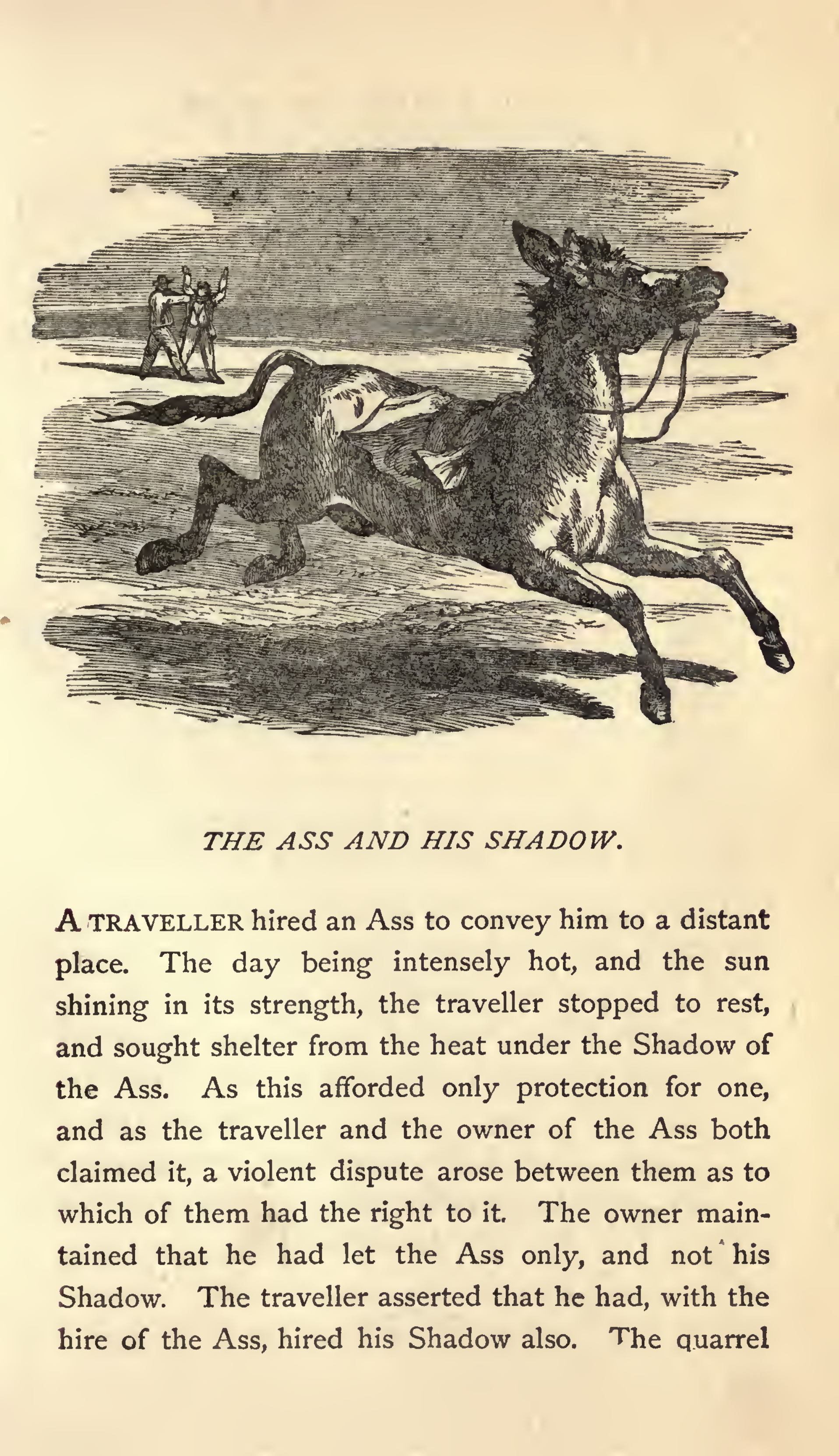 - TRAVELLER HIRED A ASS TO CONVEY THEM. AFTER A PERIOD OF TIME THE TRAVLLERS GOT TIRED AND RESTED UNDER THE SHADOW OF THE ASS.