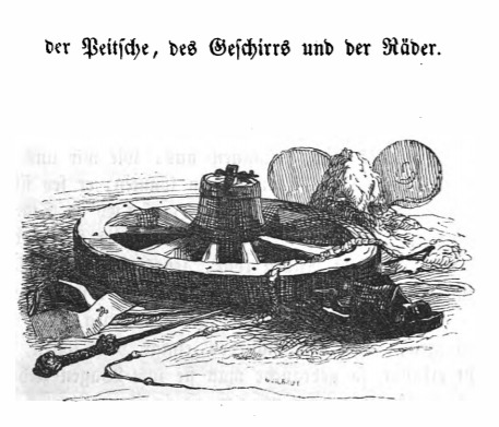 Here we see a pile with whips for horses, harnesses, and wheels for carriages. The Houyhnhnms asks about the horses in Europe and how they live. Gulliver explains that humans or yahoos govern the country and care for the horses or Houyhnhnms, and how humans use their horses, including the uses of whips and harnesses in controlling horses, and wheels on carriages. The same image appears in the 1839 Krabbe edition.