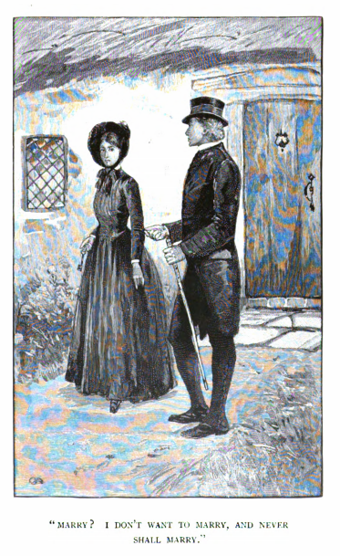 Here we see Mr. Rivers and Jane Eyre standing outside Moor House. Mr. Rivers tried to convince Jane to join him on a mission with the church to India, but she refused. He asked her to marry him before he left to go to India, but Jane refused, saying that she would never get married. He argued that missionary work was much more effective when a married couple went together, but Jane was uninterested.
