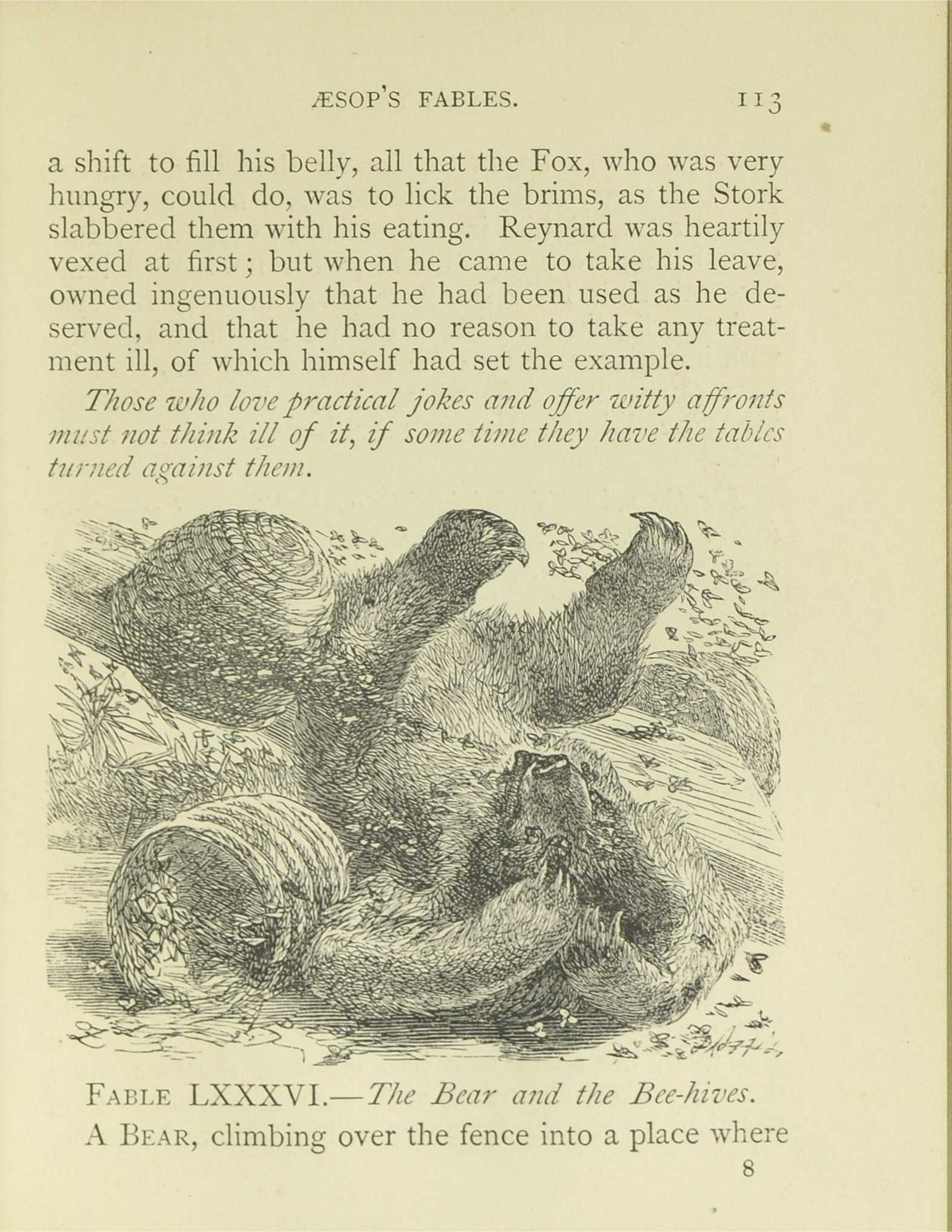 A bear rolled over on its back with its hind legs in the air covers its eyes against a swarm of bees. The beehive is split open on the left side of the page. The bear's lower back rests on top of a fence. Another beehive lies broken on the far right of the page.