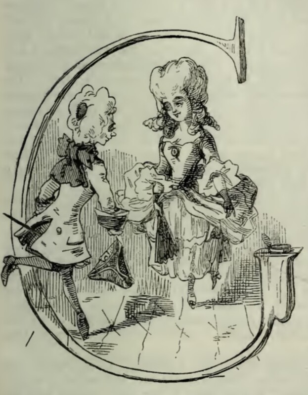 A woman in a powdered wig and frilled gown performs a curtsey. Opposite her is a man, also in a powdered wig, holding a triangular hat in his hand. The two are framed by a candle-holder in the shape of the letter G from “Good”.