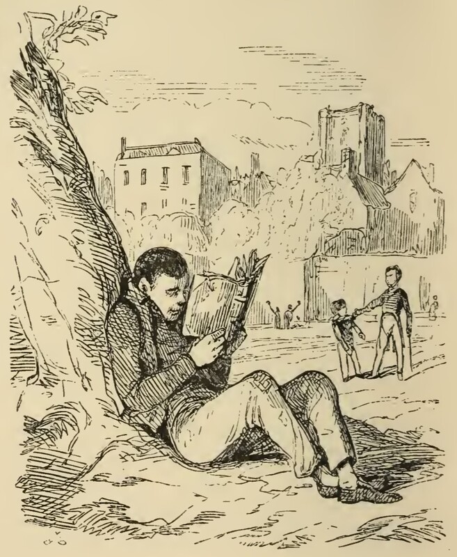 William Dobbin sits slouched against the base of a tree, reading a book. In the far background are the buildings of Dr. Swishtail’s academy. Near the buildings are a few distant figures of boys playing games. Between Dobbin and the buildings, on the right side of the image, Cuff is holding George Osborne by the collar and threatening him.
