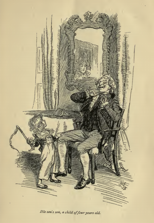 In this image we see Mr. Dashwood with his grandson. The novel opens with Mr. Dashwood’s death, and his leaving his estate to his son, John Dashwood, and his grandson. There was a caveat that John Dashwood was supposed to support his half-sisters, Elinor, Marianne, and Margaret, and his stepmother. This was a system called primogeniture in which all of the inheritance would go to the eldest son. It was the most common form of inheritance at this period. Here we see Mr. Dashwood playing with his grandson, and his mother, Fanny, is visible in the reflection of the mirror. This scene occurs in chapter 1. The characters are shown in the traditional regency style, as Mr. Dashwood and his grandson wear waistcoats and tailcoats with breeches and cravats. The regency period dated to the early nineteenth century (1811-1820) when George, Prince of Wales, later George IV (r. 1820-1830), reigned as regent for his mentally ill father, King George III (r. 1760-1820). The regency period is associated with the rise of neoclassicism in art and fashion.