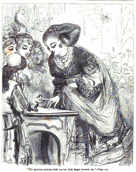 Here we see the Queen of Brobdingnag meeting Gulliver. He asked to kiss her foot, however, she held out her hand so that Gulliver could kiss her little finger. This happened after the Queen discovered Gulliver at one of his performances and she brought him back to her palace to live with, and entertain, her court.
