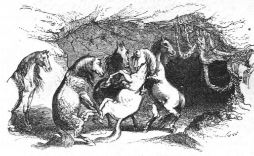Here we see a group of Houyhnhnms carrying a deceased Houyhnhnm. They carry the body towards a cave that will serve as a tomb. This image appears when Gulliver explains the lifecycle of the Houyhnhnms and their burial rites. The same image appears in both the 1839 and 1843 Krabbe editions.