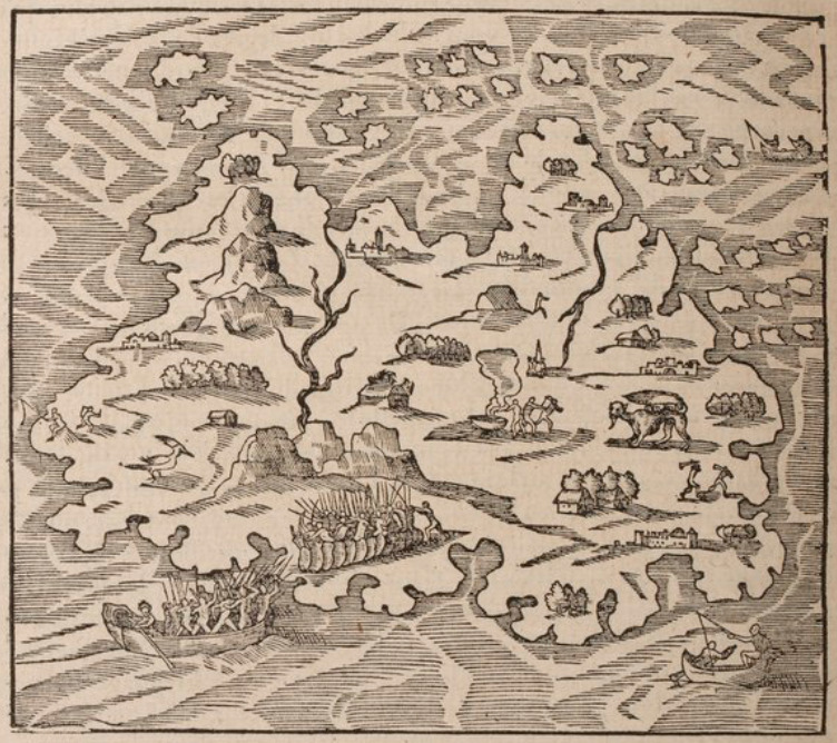 An aerial view of an island is shown, identified as Ile de la Trinité by the author (today known as the island Trinidad, of Trinidad and Tobago). Near the ‘bottom’ of the island there are two groups of Indigenous people engaged in conflict. One group stands on land defending themselves with spears, bows and arrows and shields, while the other group attacks from a rowboat or canoe on the water, also with bows and arrows and spears. Two pairs of people fish from canoes in the bottom and top right corners. Across the island, another pair of individuals fish on the left side, two others spar together on the right, and others cook around a large pot in the middle. There are several structures scattered over the island. This image is identical to one found on page 961 verso of Paris, 1575 (l’Huillier).