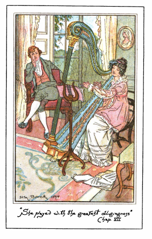 Here we see Mary Crawford playing her harp at the parsonage near Mansfield Park. Miss Crawford arrived at the parsonage near Mansfield after her sister and her husband, Dr. And Mrs. Grant, moved in. Miss Crawford and her brother, Henry Crawford, quickly became close friends with the Sir Thomas’ children, Thomas, Edmund, Maria, and Julia, and their cousin, Fanny. Miss Crawford had her harp brought from her home in Northamptonshire. Playing music was seen as a noble pastime for upper class women in this era, and women were expected to be skilled in some form of artistic endeavor, typically either music or drawing. In this image, Miss Crawford sits playing her harp with her music in a folder on a stand in front of her. Edmund sits next to Miss Crawford playing the harp, listening intently. Edmund fell in love with Miss Crawford and intended to marry her. This scene occurs in chapter 7 as noted underneath the title of this image. The characters are shown in the traditional regency style. Mary Crawford wears the regency style dress with an empire waist. Her hair is worn tied up, as was tradition for women after their “coming out” before the queen, signaling her entrance into society. Edmund wears a waistcoat and tailcoat, and knickers that stop at the knee. The regency period dated to the early nineteenth century (1811-1820) when George, Prince of Wales, later George IV (r. 1820-1830), reigned as regent for his mentally ill father, King George III (r. 1760-1820). The regency period is associated with the rise of neoclassicism in art and fashion.