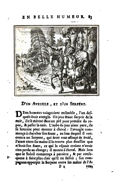 Two men were sailing together, one of whom was blind. One day, surprised by the night, they went to a meadow to rest and spend the night. When the day dawned, they got up to ride; the blind man began to look for his horse, at the place of which he met a Snake, which was all drowsy with cold, and which had to be rid of him.