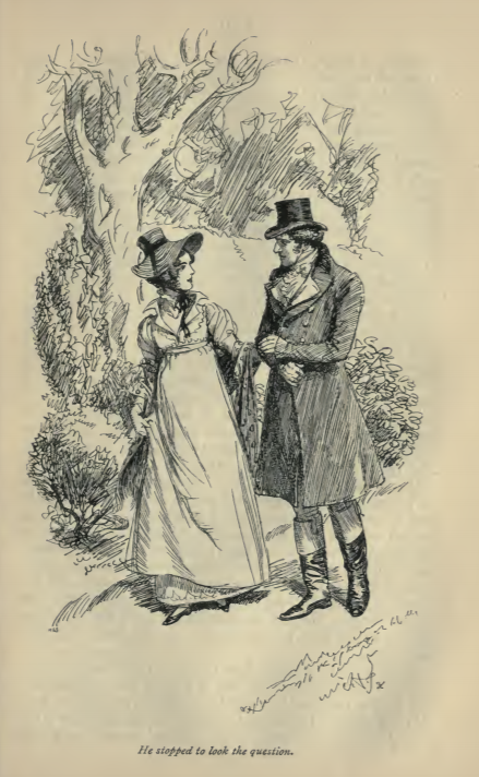 In this image Mr. Knightley tells Emma that he loves her. She was out on a walk in the gardens of Hartfield. She was upset because after finding out that Harriet loved Mr. Knightley, she came to the realization that she herself loved him. Mr. Knightley confesses that he had loved her for a long time and was jealous of Frank Churchill because he thought that Emma loved him. Emma responded that her love for Frank Churchill was not real, and that she had always loved him. This scene occurs in chapter 49. The characters are shown in the traditional regency style. Emma wears a regency style dress with an empire waist and a bonnet. Mr. Knightley wears a tailcoat and an overcoat with a cravat. The regency period dated to the early nineteenth century (1811-1820) when George, Prince of Wales, later George IV (r. 1820-1830), reigned as regent for his mentally ill father, King George III (r. 1760-1820). The regency period is associated with the rise of neoclassicism in art and fashion.