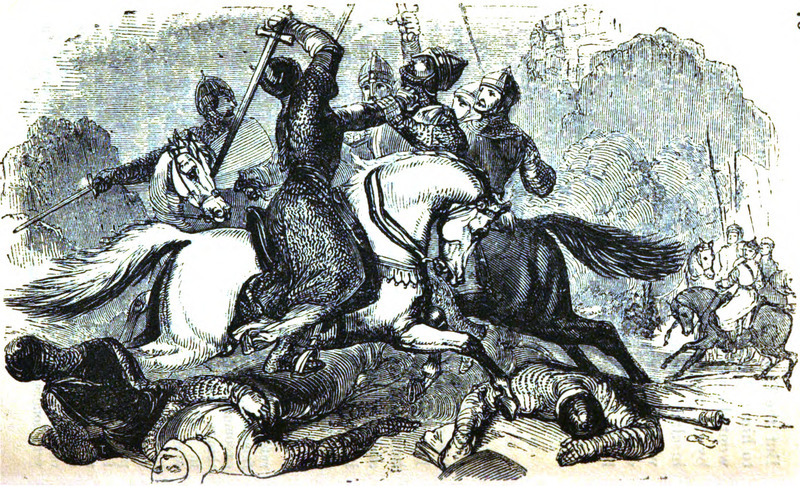 This image depicts one of the battles between King Sancho of Castile and his brothers. This one is likely from the battle against Alfonso of Leon, and it shows the Cid single-handedly rescuing Sancho from being captured by thirteen Leonese knights. Sancho is fighting his brothers because his father left them each portions of his kingdom when he died, and Sancho is trying to consolidate these portions all under his own rule. In the image, the Cid is holding a man by his neck and is about to strike him with his sword.