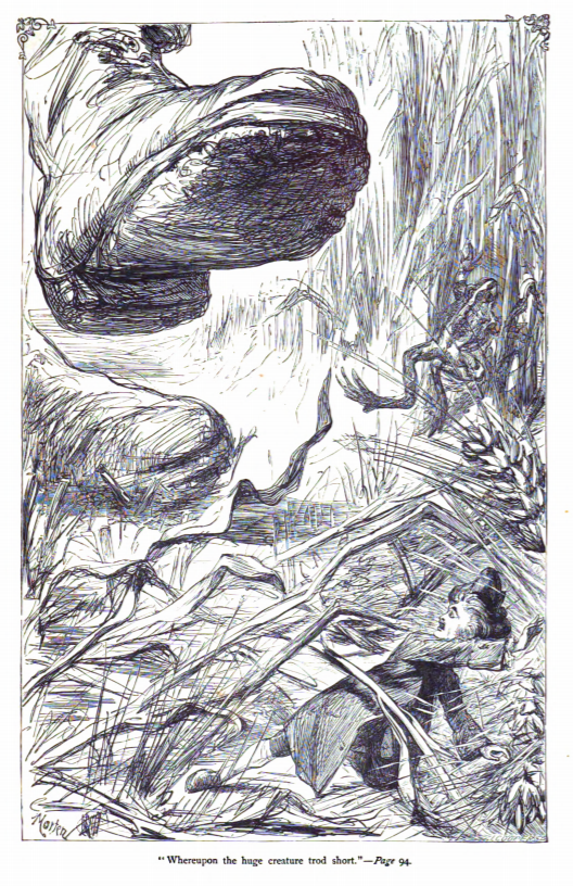 After being stranded on Brobdingnag, Gulliver runs through the wheat field where the giant farmer is working. Not wanting to be discovered, he dodges out of the way of the giant’s foot, fearing he would be stepped on.