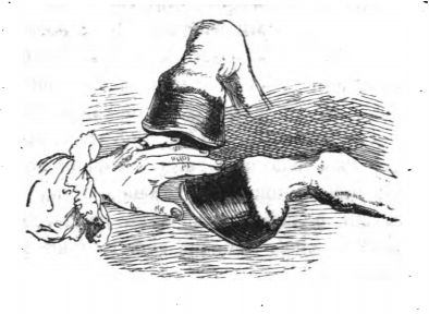 Here we see Gulliver’s master holding Gulliver’s hand between his hoofs. Gulliver explains the difference between his body and his hands to those of females of his species. He explains that although he has nails on his hands and feet, the skin on his hands and feet were too soft to walk on without protection. The same image appears in the 1843 Krabbe edition.