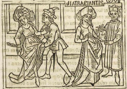 This engraving depicts the queen of the Galatians standing on the right side of the image holding a decapitated head. This woman’s name is unknown; however, she is the wife of King Drigiagon (whose name is engraved above her head). After being taken as a captive by Roman enemies, the Galatian woman was defiled by a Roman centurion. This is depicted on the left side of the engraving as the queen is bound by a chain on her right hand while the centurion is putting his hand up her dress. She is illustrated looking away and fighting back as he forces himself onto her. To seek her vengeance, once she was freed through ransom, she ordered her servant to decapitate the man who raped her. The Galatian woman is holding the severed head as she presents it to her husband to prove that she was defiled by this man. Boccaccio explains that she wrote on this woman to highlight her daring and courageous nature.