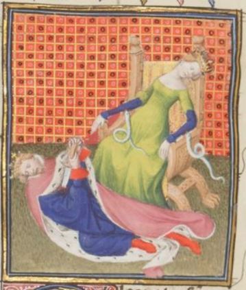 This illumination depicts the Roman general Mark Antony and his wife, Queen Cleopatra of Egypt, killing themselves. After fleeing a battle with Octavian, Mark Antony stabbed himself to avoid dying at the hands of his enemies. He is illustrated lying on the ground with a knife in his chest. Boccaccio believes that Cleopatra killed herself by cutting her wrists and putting asps in the wounds to poison herself. She is illustrated sitting in a chair with her head fallen over to the side. The asps are depicted by her wrists.