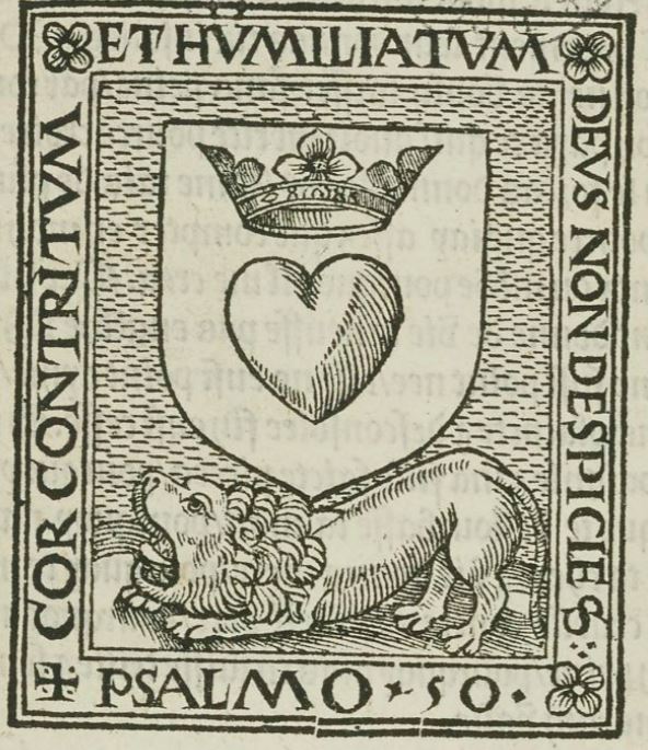 The center of this end-page illustration features a crown suspended above a heart, both of which are placed on a shield or crest. A lion is on the ground beneath them, resting on its front legs while its back legs remain upright. This image is surrounded by a border that contains a Biblical quote (given in the title of the illustration). It is odd that this is quoted as being from Psalm 50, since in reality it is Psalm 51:17. It is possible that the artist may have been working from a different rendition of the Bible, although the early editions that I have consulted also place this in Psalm 51.