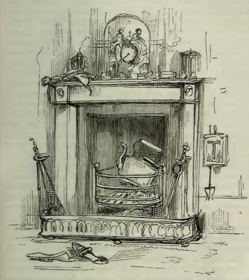 An unburning fireplace, with the kettle fallen onto the coals. On the mantle is a clock with two figures. A pair of slippers are abandoned in front of it, and on the wall to the side, the poker-holder is decorated with the letter T from “There”.