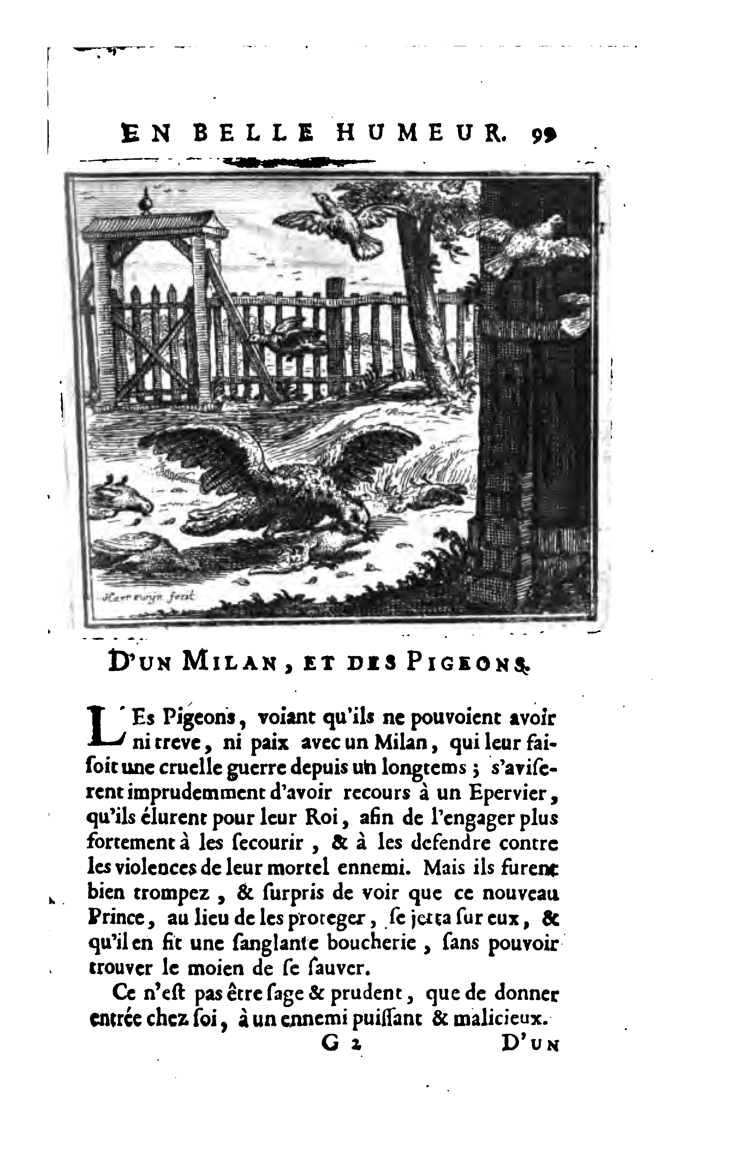The image depicts a hawk killing many pigeons. Fearing for their safety, after seeing a red kite fly overhead, the pigeons invite a hawk in the farm in return for the hawk’s protection. Once admitted the hawk turns on the pigeons and does more damage to them in one day than the kite would have been able to do.