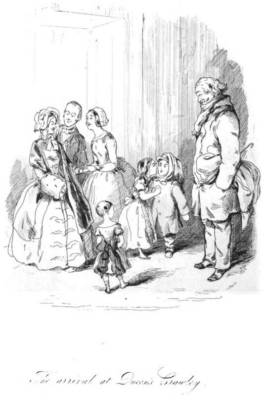 Matilda Crawley greets her cousin, the younger Rawdon Crawley, while her brother Pitt Binky hangs back and watches. To their side is Mr. Rawdon Crawley, watching his son. In the background, Sir Pitt and Lady Jane are greeting Rebecca Crawley, who has just arrived at Queen’s Crawley with her husband and son. Below the illustration is printed in cursive its title, “The arrival at Queen’s Crawley.”