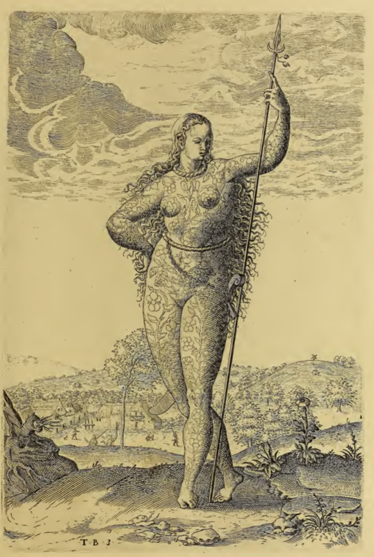 A young Indigenous woman is shown from the front. She carries a spear in her left hand. Her hair is long, she wears a twisted cord around her neck, and a sword with a curved blade hangs another cord around her waist. She is nude, and her body is covered in painted designs. The Picts were an Indigenous group who lived in Britain long before the author’s time. Images of Picts were included in this book so that readers could compare their customs to those of the Indigenous people living in Virginia.