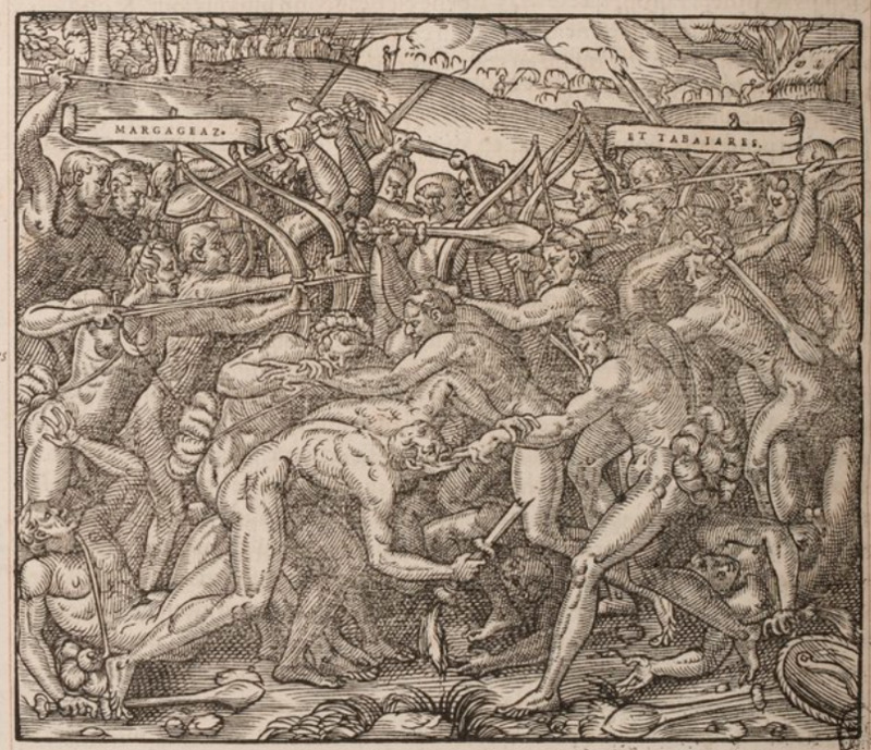 Two groups of Indigenous people (the Margageaz and the Tabaiares, according to the author) are shown engaged in combat. Both groups are comprised of men wielding an assortment of clubs, bows and arrows, shields and spears. Some also use their teeth as weapons, biting the hands and arms of their enemies. Members of both groups wear necklaces and round feathered adornments hanging at their backs. In the background, a group of combatants stands on a hill and to the right a structure appears to be on fire. This image is identical to one found on page 942 verso of Paris, 1575 (l’Huillier).