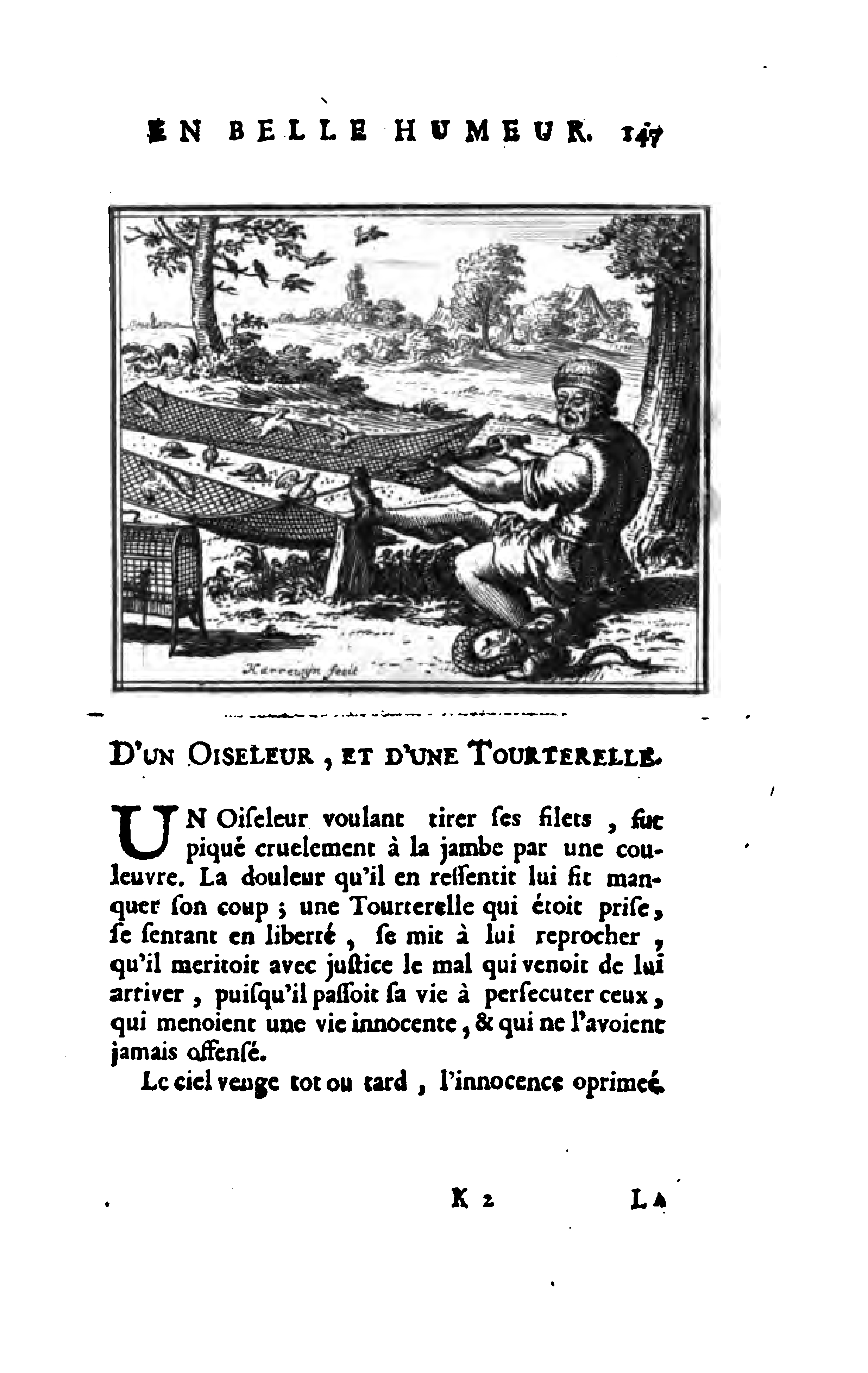 A bird catcher spread his nets and tied his domesticated pigeons to them. He watched from a distance and a dove approached to try and free them, but became entangled as well. The bird catcher ran back and grabbed them. As he did so, he reproached the domesticated pigeons because they should have warned their own kind of the trap. But, the domesticated pigeons replied: We are more concerned with preventing our master's displeasure than with pleasing our kindred.