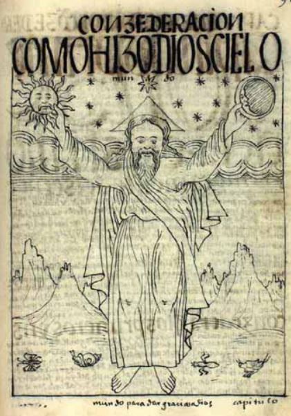 This is the first image in the last chapter of the book. The author uses this chapter to address his Christian readers. For this image, the author urges his readers to consider their service to God, the creator of all things. This image depicts God standing in the centre of the image holding a sun with his right hand and the moon with his left with stars surrounding his head. He is wearing a triangular halo which symbolizes the Holy Trinity. He is also depicted bearded and wraped in cloaks. On the ground by God’s feet are a butterfly, a snail, an ant, and a cricket. These are to symbolize God’s creation of all things in the world. The mountainous Andean landscape is visible in the background. The caption at the bottom of the image reads, “mundo para dar gracias a Dios” [the world, for giving thanks to God].