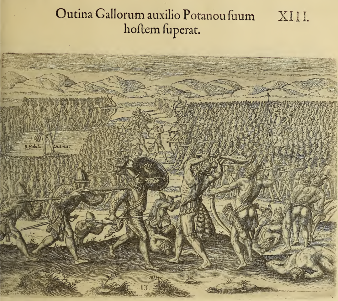 A battle is shown between two groups of Indigenous people. The groups are armed with bows and arrows, clubs, and spears. The group on the left stands in a square formation with a gap in the middle. The French colonists fight on the side of Chief Outina (pictured in the middle of the group on the left). In the foreground, colonists shoot at Indigenous men on the opposing side with rifles.