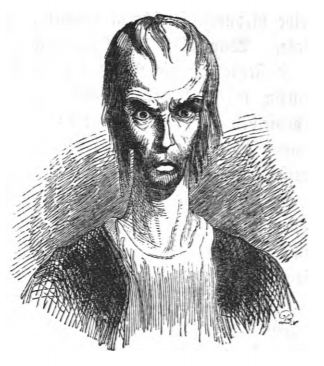 Here we see the scientist nicknamed the ‘universal artist’ from the Grand Academy on Balnibarbi. This man oversaw fifty other scientists all working on several different hypotheses, including condensing air into a tangible substance, softening marble to use it as pillows, petrifying hooves of living horses, and sowing the land with chaff to make it more virtuous. Gulliver encountered him in the wing of speculative learning. This man is likely an allusion to Sir Robert Boyle, a scientist who conducted experiments in several aspects of the natural world and was also a theologian. In this image, the scientist is depicted with a particularly large head, likely to indicate his intelligence. The same image appears in the 1839 Krabbe edition.