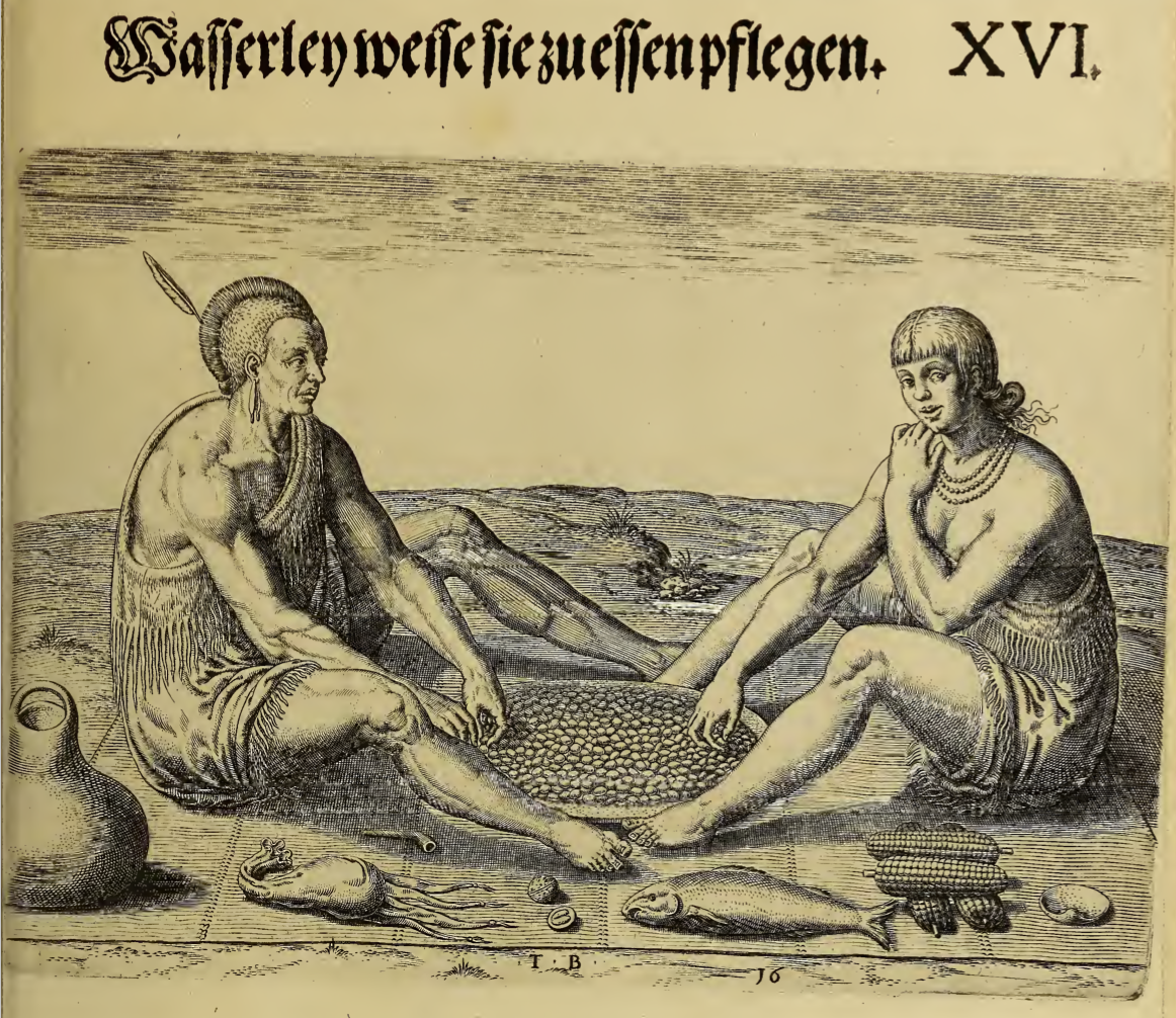 Two Indigenous people are shown sharing a meal. A man sits on the left, and a woman on the right. They sit on a mat on the ground. A large dish with food is between them, and around them are a jug, a pipe, some nuts, a fish, some cobs of corn, and other objects. The man wears a fringed garment draped around his body and over one shoulder and a single feather in his hair. The woman wears a similar fringed garment draped over one shoulder and two strands of beads around her neck.