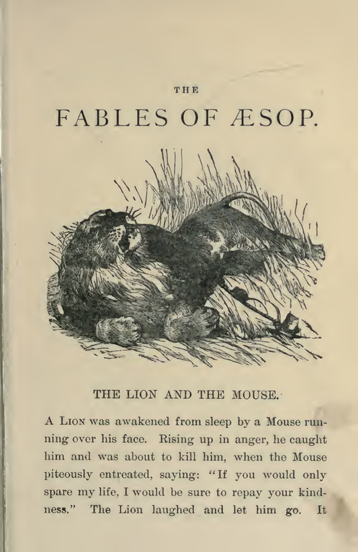 A lion lies on its side on the ground among the grass. It is stuck in a trap, and rope binds it to the ground. The lion is looking upwards, its ears bent down and looking helpless. On the right side, it is visible that a mouse is on the rope tying the lion down, making its way through the rope.