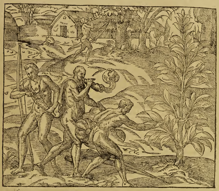 Three Indigenous men stand in the foreground beside a tall leafy tobacco plant. Two of the men hold tobacco leaves rolled up, one is lighting the end of the roll of leaves and the other has already lit his and is smoking. The third man reaches for a leaf from the plant. Two of the men carry bows, and the one on the left wears a necklace, in the middle a cape, and to the right a round feathered adornment. In the background closer to the village, several structures of which can be seen, another man carrying a bow smokes from a rolled leaf. This image is identical to one on page 927 of Paris, 1575 (Chaudière).