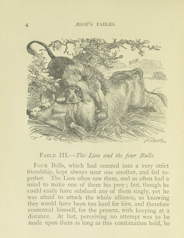 Four Bulls, which had entered into a very strict friendship, kept always near one another, and fed together. The Lion often saw them, and as often had a mind to make one of them his prey; but, though he could easily have subdued any of them singly, yet he was afraid to attack the whole alliance, as knowing they would have been too hard for him, and therefore contented. himself for the present, with keeping at a distance.