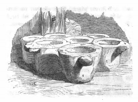 Here we see a set of cups used by the Houyhnhnms. This image appears when Gulliver explains how the Houyhnhnms use the hollow part of their pastern and hoof on their forefeet similarly to hands. Gulliver says they use this part of their bodies to do things like thread needles, milk cows, reap oats, and operate tools, including cups. These cups are made of wood and clay and are baked in the sun. The same image appears in the 1843 Krabbe edition.