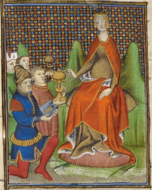 This illumination depicts Queen Joanna of Jerusalem and Sicily sitting on a throne with her subjects surrounding her. She is depicted wearing a crown to demonstrate her royal status. Her subjects appear to be handing her gifts. Boccaccio explains that Joanna was a praiseworthy subject to write on as she was an impressive and fierce ruler which was not common for women during her time.