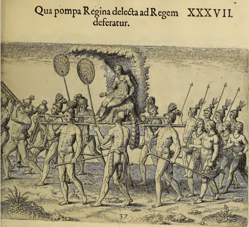 The chosen queen is carried on a litter by four men. Her body is decorated with paint or tattoos, and she wears strands of beads around her neck, arms and legs. Several men in front of the procession play large instruments, and a man walks on either side of the litter each waving a fan beside the queen. Behind the procession several women and men, the women carrying baskets and the men spears.