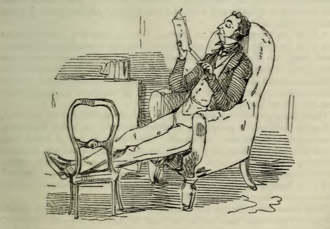 Jones, a reader of the story, is seated in an armchair with his legs crossed and feet on an open-backed chair. He is holding his copy of the serial in his right hand and holding a pencil to underline a phrase in it with his left. In the background is a table or cabinet upon which some objects are set.