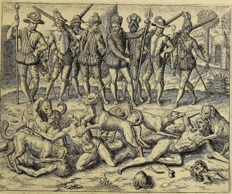 Spanish colonists punish Indigenous men for engaging in sex with other men. Several Indigenous men on the ground try to fend off hunting dogs which have been unleashed on them. The dogs bite at the surviving men; several men have already been dismembered and killed by the dogs. A group of Spaniards stand nearby, watching the vicious attack. The men are finely dressed, and carry muskets, swords, spears, and a flag or banner. In the background, at least two dwellings are visible.