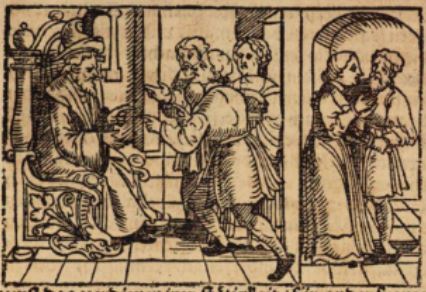This engraving depicts the tragic fate of a young virgin woman from Rome named Verginia. Boccaccio explains that one of the decemvirs, Appius Claudius, fell madly in love with Verginia. Despite already being betrothed to another man, Appius Claudius devised a plan to have Verginia as his own. Appius Claudius had gotten one of his freedmen (Marcus Claudius) to capture Verginia and claim her as a slave. Verginia’s father, Verginius, went to the trial and protested the sentence of his daughter becoming a slave. Appius Claudius, however, was the judge presiding over the case, and officially decreed Verginia to be a slave. This court trial is depicted on the left side of the engraving, with Appius Claudius sitting on the chair pointing towards Verginia, Verginius, and Verginia’s betrothed, Icilius. After Claudius decrees Verginia to be enslaved, her father takes a knife and stabs her with it as his only way to save her. This is depicted on the right side of the engraving, which illustrates Verginius piercing his daughter’s chest.