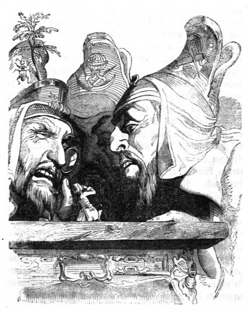 In this image we see Gulliver being examined by three scholars from Brobdingnag. The scholars were invited by the king to examine Gulliver’s ‘physical form’. They came to the conclusion that he did not conform to the ‘usual course of nature’, as he was significantly smaller than any other creature on Brobdingnag. They also questioned him regarding his diet and his education. There are three giants crowded around Gulliver who is standing on a table. They each wear elaborate hats and have beards. The giant on the left holds a magnifying glass to his left eye. His hat has what looks like a tree and an insect on top. The centre giant’s face is somewhat in shadow, and his hat has an image of a compass and a globe. The man on the right has depictions of scientific instruments on his hat. Gulliver is seated on a table that is elaborately carved and looks up at the giants. The same image appears in the 1839 Krabbe edition.