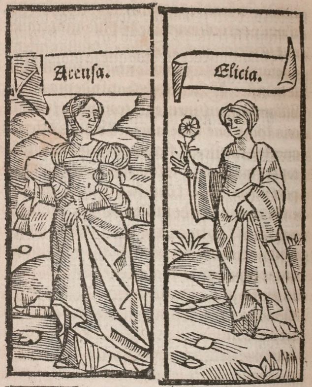 The left panel depicts Celestina’s prostitute Areusa wearing a veil and a robe. To the right, we see Celestina’s other prostitute Elicia, who is also wearing a veil and a robe. In her right hand, she is holding a flower. Both figures are placed outside.The entire image is identical to the one found on page 306. The left panel is identical to those found on pages 173 and 317, and is nearly identical to those found on pages 12, 208 and 271 (where it is labeled ‘Melibea’), page 84 (labeled ‘Lucrecia’), and page 350 (labeled ‘Alisa’). The right panel is nearly identical to those found on pages 84 (where it is labeled ‘Celestine’), 235 (labeled ‘Lucrece’), and 299 (labeled ‘Alisa’).