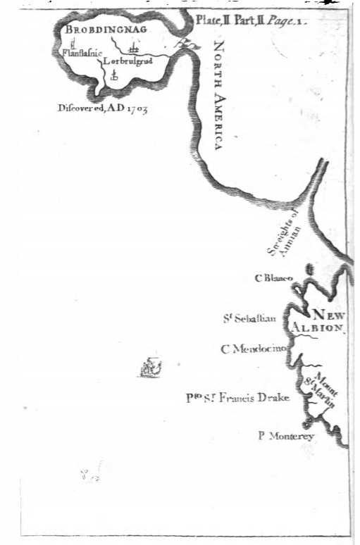 The image depicts the fictional land of Brobdingnag, off of North America. The cities of Flagnlamic and Lorbrulgrud are shown in Brobdingnag. Underneath Brobdingnag reads “Discovered AD. 1703”. The bottom half of the map includes New Albion. A ‘man-of-war ship is shown off the coast of New England, and a dolphin is near the bottom of the image. The same map is featured in several other editions of the text, including those in other languages, such as German.