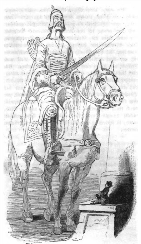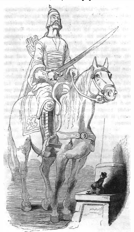 In this image we see Gulliver sitting on a base of a column, looking up at a member of the cavalry on Brobdingnag. The cavalry rides a horse and holds a sword. He wears military attire and helmet. Gulliver tells the reader that when measuring the horse and its rider together they stand over one hundred feet tall. The same image appears in the 1843 Krabbe edition.