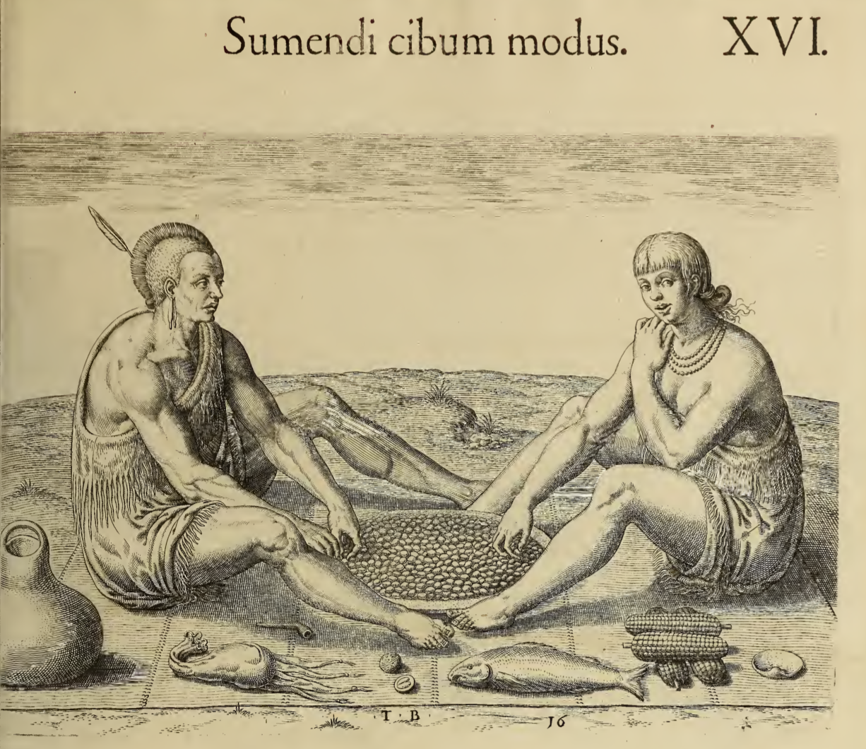Two Indigenous people are shown sharing a meal. A man sits on the left, and a woman on the right. They sit on a mat on the ground. A large dish with food is between them, and around them are a jug, a pipe, some nuts, a fish, some cobs of corn, and other objects. The man wears a fringed garment draped around his body and over one shoulder and a single feather in his hair. The woman wears a similar fringed garment draped over one shoulder and two strands of beads around her neck.