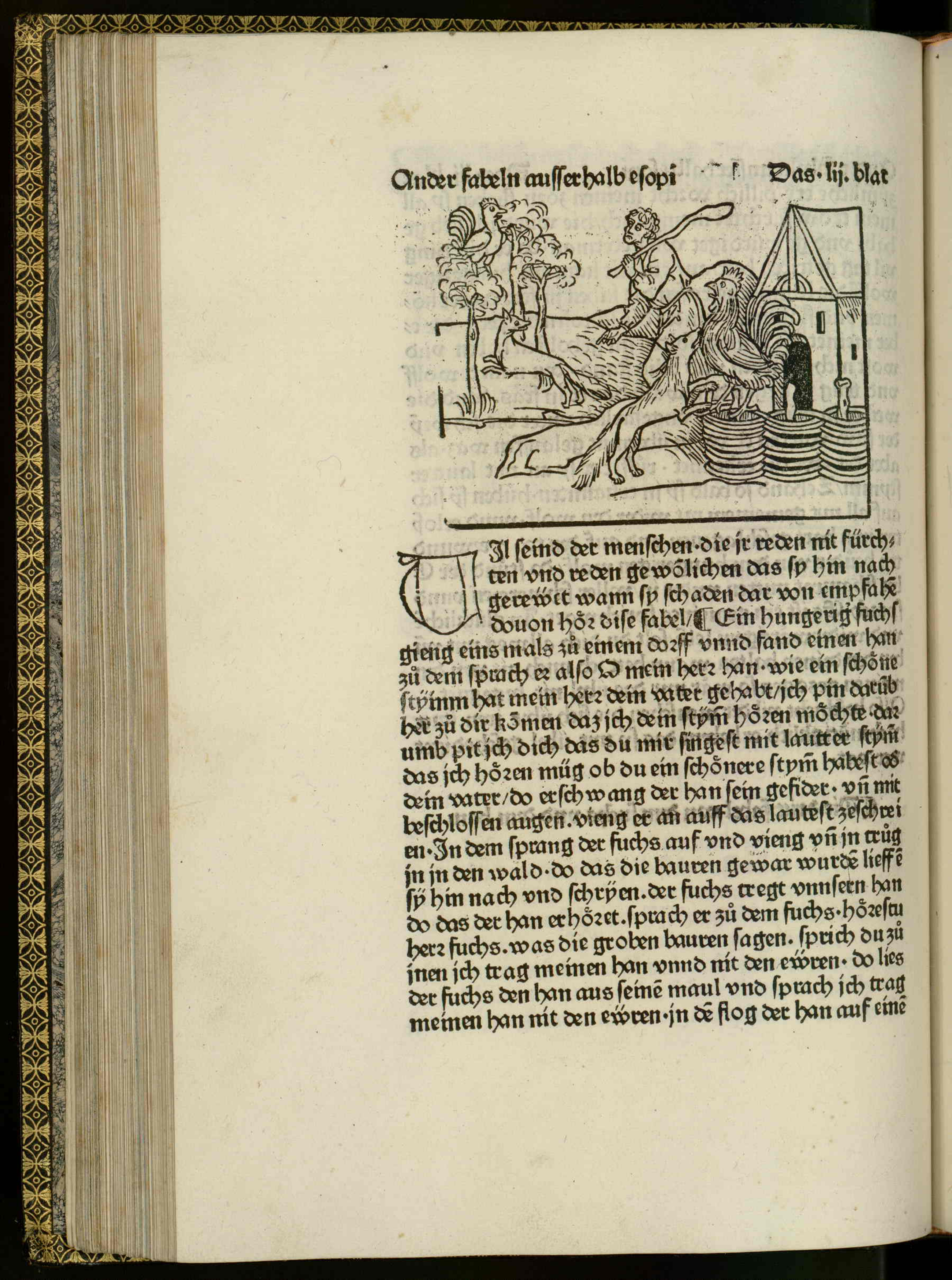 - On the left side of the image, there is a rooster on the top of tree and a fox being chased away by a human with a wooden stick. On the right side of the image, there is a wolf about to attack a rooster. Behind them there is a barn.