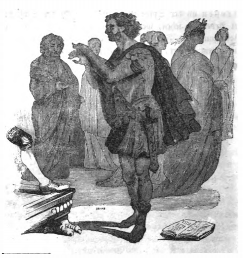 Here we see Gulliver and the Governor of Glubbbdubdrub, who was a necromancer. After speaking with Alexander the Great, the Carthaginian General, Hannibal appeared. Hannibal assured Gulliver he did not have any vinegar with him when he crossed the Alps. The Roman historian Livy wrote that Hannibal softened the rock of the Alps by pouring vinegar over them and letting them soften in the sun, making their demolition much easier. The same image appears in the 1843 Krabbe edition.