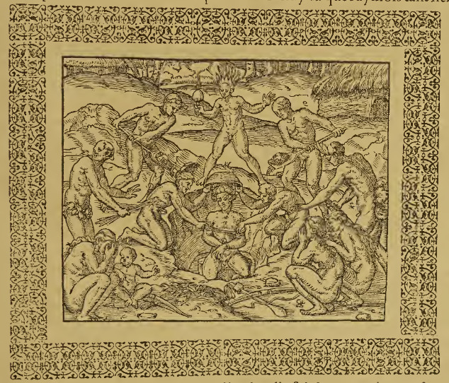A group of Indigenous people are in the process of burying the body of a deceased man. The body has been bound with rope about the arms and wrists and has been placed into the grave in a kneeling position. Two men kneel on either side of the grave each gripping one of the deceased man’s arms and holding a basket over his head. Two different men shovel dirt into the grave, and a third stands at the head of the grave holding a rattle or ornament and wearing a feathered headdress. Three women, one with a child by her side, crouch around the grave with their hands over their faces in distress, and there are bows and a club on the ground near their feet, perhaps to be buried with the deceased. This image is identical to one found on page 926 of Paris, 1575 (Chaudière), and in Thevet’s Les Singularitez de la France Antarctique (page 82 verso of Paris, 1557 and page 82 verso of Paris, 1558).