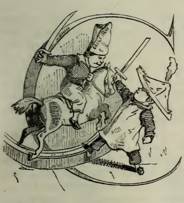 Two figures are depicted on a backdrop of the letter C from “Cuff”. The figure on the left is a boy with a toy sword and tall newspaper hat, riding a rocking horse, representing Cuff. This figure is bearing down on the other, representing William Dobbin, who has a triangular newspaper hat with a plume and a wooden sword raised to block his opponent.