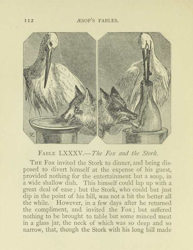 The image is shaped into two tall octagonal panels side by side. The left panel shows a large stork standing behind a fox, looking down upon it with annoyance. The fox’s head is visible in the bottom right corner lapping up a bowl of soup from a wide shallow dish, its eyes craned up to look at the stork. The right panel shows the same crane and fox, however now the crane is eating minced meat out of a long, tall cylindrical container and the fox is seen in the bottom left corner licking the side of the container for drips of food. The fox looks displeased at this, whereas the stork is satisfied.