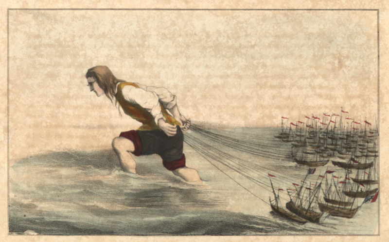 [Gulliver pulls ships back to Blefuscu]
